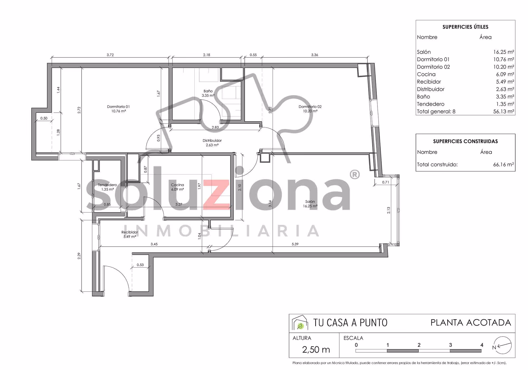 Cuenta con 62 m² construidos según catastro (54 m² útiles), muy bien aprovechados: recibidor, salón comedor de paso, cocina con salida a terraza-tendedero cubierta, dos dormitorios y un cuarto de baño completo.