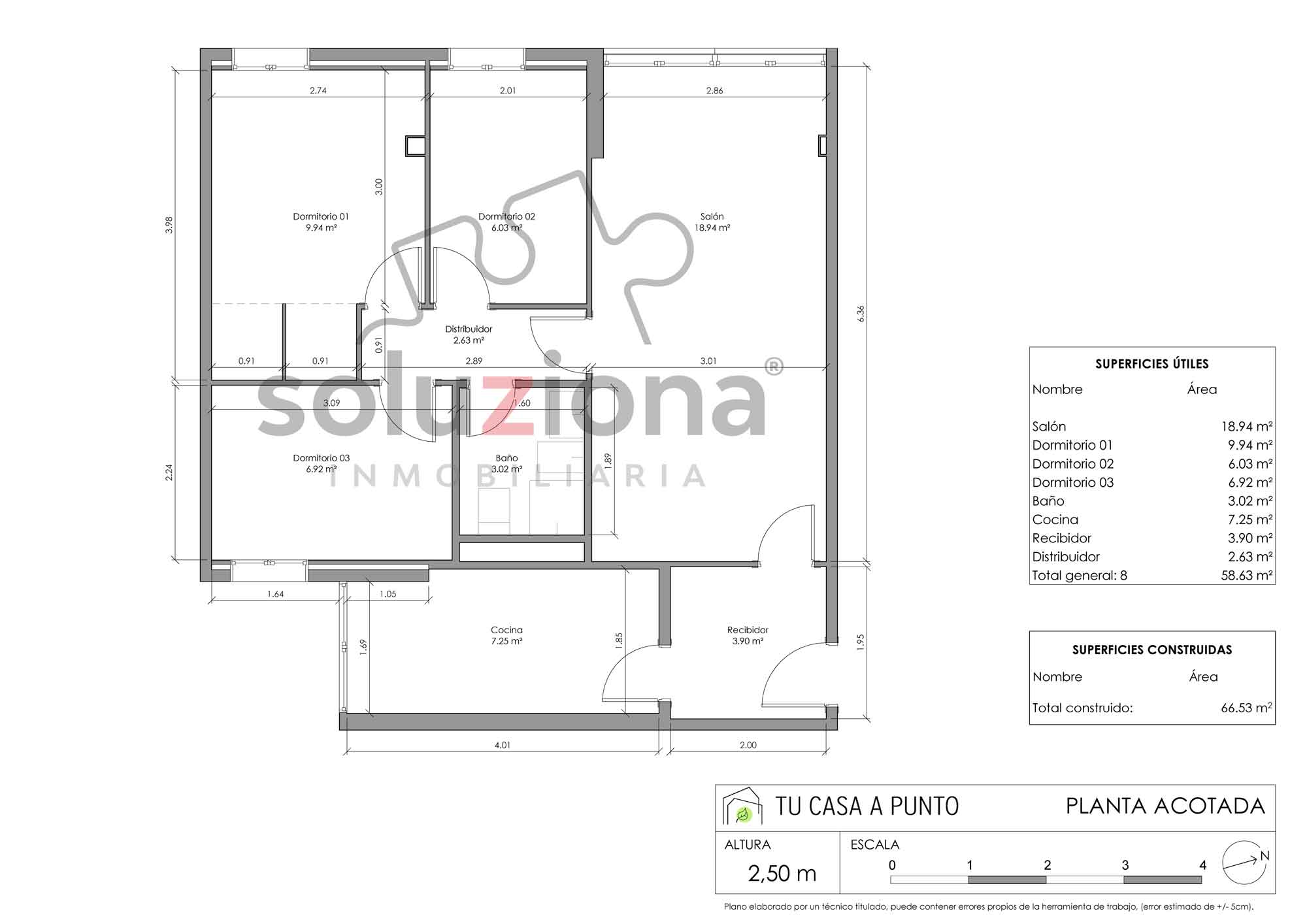Cuenta con 58 m2 útiles y 67 m2 construidos según Escritura, distribuidos en recibidor-distribuidor, cocina, salón de paso, tres dormitorios y un cuarto de baño completo.