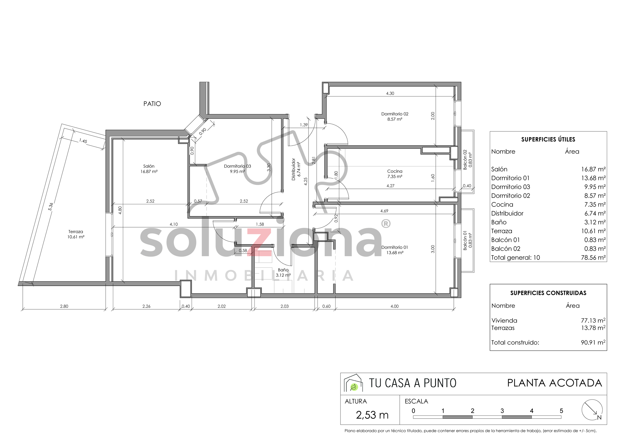 Dispone de 70 m2 útiles y 83 m2 construidos según Escritura, distribuidos de forma muy funcional en recibidor-distribuidor, amplio salón comedor independiente, cocina, tres dormitorios y un cuarto de baño completo (anteriormente dos). Además, cuenta con una amplia terraza equipada con toldo eléctrico, perfecta para disfrutar del exterior con comodidad durante todo elaño.
